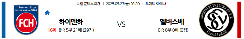 2025년 5월 23일 분데스리가1, 하이덴하임 엘버스베르크, 분데스리가 분석, 독일 축구 베팅, 스포츠 토토, 하이덴하임 승리 예측, 엘버스베르크 경기 분석, 분데스리가 순위, 축구 배당률, 분데스리가 전문가, 축구 경기 분석, 토토 가이드, 분데스리가 언더오버, 분데스리가 핸디캡, Voith-Arena, 독일 프로축구, 분데스리가 중위권, 축구 승부 예측.