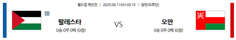 ▶ 2025년 6월 11일 03:15 (한국 시각) | 카타르 도하 자심 빈 하마드 스타디움 (Jassim Bin Hamad Stadium, Doha, Qatar) | 2026 FIFA 월드컵 아시아 2차 예선 | 팔레스타인 vs 오만