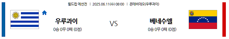 ▶ 2025년 6월 11일 08:00 (한국 시각) | 몬테비데오 에스타디오 센테나리오 (Estadio Centenario, Montevideo, Uruguay) | 2026 FIFA 월드컵 남미 지역 예선 | 우루과이 vs 베네수엘라