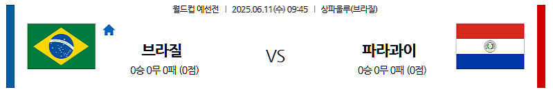 ▶ 2025년 6월 11일 09:45 (한국 시각) | 리우데자네이루 에스타디오 마라카낭 (Estádio do Maracanã, Rio de Janeiro, Brazil) | 2026 FIFA 월드컵 남미 지역 예선 | 브라질 vs 파라과이