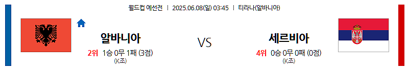 ▶ 2025년 6월 8일 03:45 (한국 시각) | 알바니아 티라나 에어 알바니아 스타디움 | FIFA 월드컵 유럽 지역 예선 | 알바니아 vs 세르비아