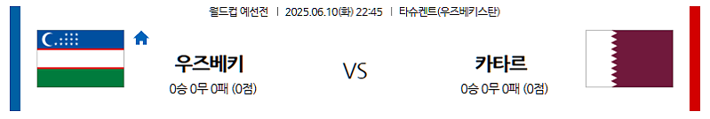 ▶ 2025년 6월 10일 22:45 (한국 시각) | 타슈켄트 밀리이 스타디움 (Milliy Stadium, Tashkent) | 2026 FIFA 월드컵 아시아 2차 예선 | 우즈베키스탄 vs 카타르