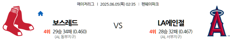 안녕하세요, 뜨거운 MLB 리그의 열기를 사랑하는 야구 전문 분석 기자이자 스포츠 베팅 전문가입니다! 2025년 6월 5일 새벽 2시 35분 (한국 시간)에 펼쳐질 MLB 정규시즌의 중요한 경기, 보스턴 레드삭스와 LA 에인절스의 숨 막히는 대결을 심층 분석하여 여러분의 스포츠 토토 전략에 필요한 모든 핵심 정보를 제공하고자 합니다. 펜웨이 파크의 뜨거운 열기 속에서 펼쳐질 보스턴의 홈 이점과 강력한 타선, 그리고 에인절스의 젊은 야수진! 승패를 가르는 냉철한 데이터와 흥미진진한 이야기를 지금부터 함께 예측해 볼게요!