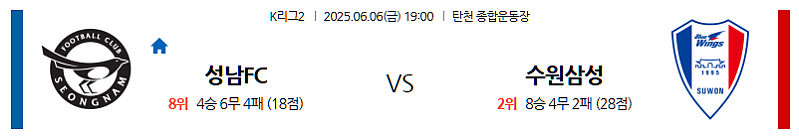▶ 2025년 6월 6일 19:00 | 탄천종합운동장 | K리그2 | 성남 FC vs 수원 삼성
