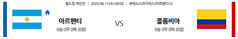 ▶ 2025년 6월 11일 09:00 (한국 시각) | 부에노스아이레스 에스타디오 모누멘탈 (Estadio Monumental, Buenos Aires, Argentina) | 2026 FIFA 월드컵 남미 지역 예선 | 아르헨티나 vs 콜롬비아