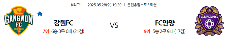 2025년 5월 28일 오후 7시 30분 (한국 시간) | 춘천송암스포츠타운 (Chuncheon Songam Sports Town) | K리그1 | 강원 FC vs FC 안양