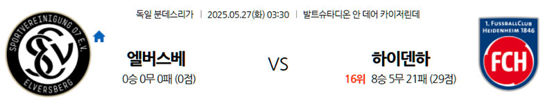 2025년 5월 27일 오전 3시 30분 (한국 시간) | 슈타디온 안 데어 카이저린게 (Ursapharm-Arena an der Kaiserlinde) | 독일 분데스리가 (Bundesliga) | SV 엘버스베르크 vs 1. FC 하이덴하임