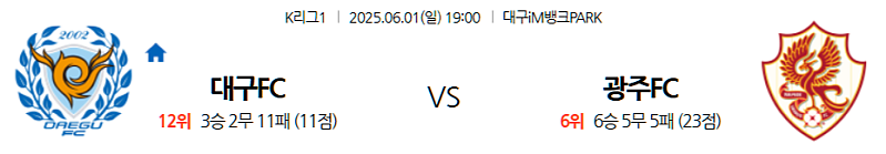 2025년 5월 31일 19:00 (한국 시간) | DGB대구은행파크 (DGB Daegu Bank Park), 대구 | K리그1 | 대구 FC vs 광주 FC