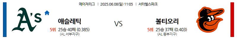 ▶ 2025년 6월 8일 11:05 (한국 시각) | 오클랜드 콜리세움 (Oakland Coliseum) | MLB 정규시즌 | 오클랜드 애슬레틱스 vs 볼티모어 오리올스