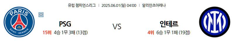 2025년 6월 1일 04:00 (한국 시간) | 알리안츠 아레나 (Allianz Arena), 뮌헨 (독일) | UEFA 챔피언스리그 결승전 | 파리 생제르맹 (PSG) vs 인터 밀란