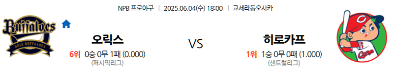 안녕하세요, 뜨거운 NPB 리그의 열기를 사랑하는 야구 전문 분석 기자이자 스포츠 베팅 전문가입니다! 2025년 6월 4일 오후 6시 (한국 시간)에 펼쳐질 NPB 인터리그의 중요한 경기, 오릭스 버팔로스와 히로시마 도요 카프의 숨 막히는 주중 2차전 대결을 심층 분석하여 여러분의 스포츠 토토 전략에 필요한 모든 핵심 정보를 제공하고자 합니다. 교세라 돔 오사카의 뜨거운 열기 속에서 펼쳐질 오릭스의 홈 이점과 압도적인 투수진, 그리고 히로시마의 탄탄한 조직력과 젊은 타선! 어제 경기의 흐름을 이어갈 팀은 누가 될지, 냉철한 데이터와 흥미진진한 이야기를 지금부터 함께 예측해 볼게요!