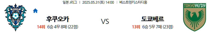5월 31일 J1 리그: 후쿠오카, 홈에서 도쿄 베르디 꺾고 상승세 이어갈까? 도쿄 베르디, 원정에서 반전 노릴까?