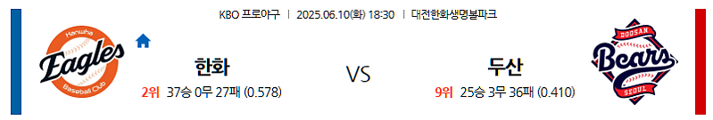 ▶ 2025년 6월 10일 18:30 (한국 시각) | 서울 잠실 야구장 (Seoul Jamsil Baseball Stadium) | KBO 리그 | 한화 이글스 vs 두산 베어스