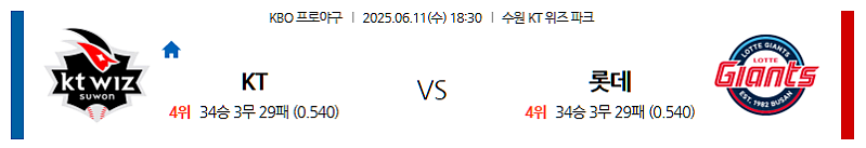 ▶ 2025년 6월 11일 18:30 (한국 시각) | 부산 사직 야구장 (Sajik Baseball Stadium, Busan, South Korea) | KBO리그 (KBO League) | KT 위즈 vs 롯데 자이언츠