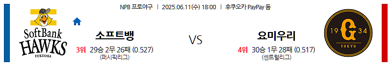 ▶ 2025년 6월 11일 18:00 (한국 시각) | 후쿠오카 페이페이 돔 (Fukuoka PayPay Dome, Fukuoka, Japan) | NPB (일본 프로야구) 인터리그 | 후쿠오카 소프트뱅크 호크스 vs 요미우리 자이언츠
