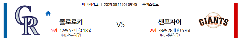 ▶ 2025년 6월 11일 09:40 (한국 시각) | 콜로라도 쿠어스 필드 (Coors Field, Denver, Colorado) | MLB (메이저리그 야구) | 콜로라도 로키스 vs 샌프란시스코 자이언츠