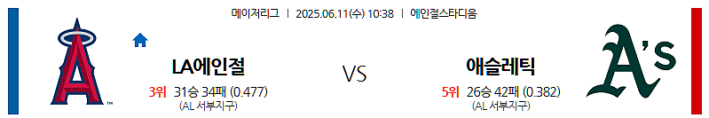 ▶ 2025년 6월 11일 10:38 (한국 시각) | 애너하임 에인절 스타디움 (Angel Stadium of Anaheim, Anaheim, California) | MLB (메이저리그 야구) | LA 에인절스 vs 오클랜드 애슬레틱스