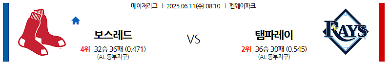 ▶ 2025년 6월 11일 08:10 (한국 시각) | 보스턴 펜웨이 파크 (Fenway Park, Boston, Massachusetts) | MLB (메이저리그 야구) | 보스턴 레드삭스 vs 탬파베이 레이스