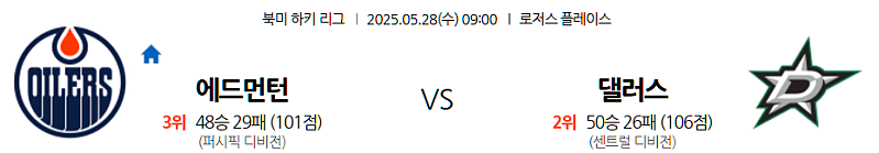 2025년 5월 28일 오전 9시 00분 (한국 시간) | 아메리칸 에어라인스 센터 (American Airlines Center) | NHL 플레이오프 서부 컨퍼런스 파이널 | 에드먼턴 오일러스 vs 댈러스 스타스