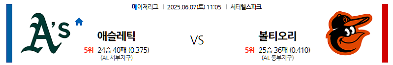 ▶ 2025년 6월 7일 11:05 (한국 시각) | 오클랜드 콜리세움 | MLB (메이저리그 야구) | 오클랜드 애슬레틱스 vs 볼티모어 오리올스