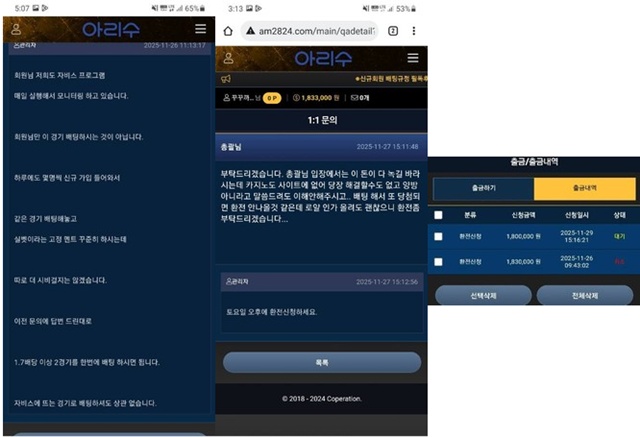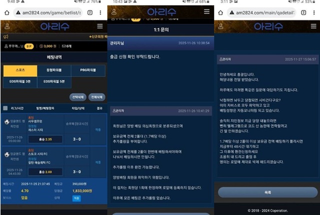 아리수 먹튀 사건이 또 터졌습니다. 신규 오픈을 가장한 사이트들이 연이어 먹튀를 반복하고 있는 가운데, am2824.com (아리수) 도 결국 같은 수법으로 피해자를 양산했습니다. 183만원 당첨금 환전 신청 후 갖은 핑계로 지연시키더니, 주말이 지나자마자 아이디를 차단하는 전형적인 먹튀 패턴입니다.
